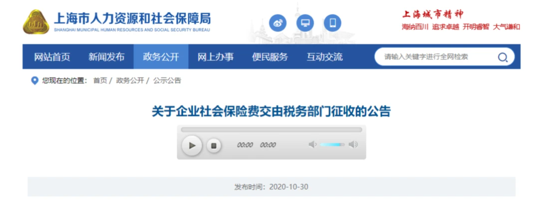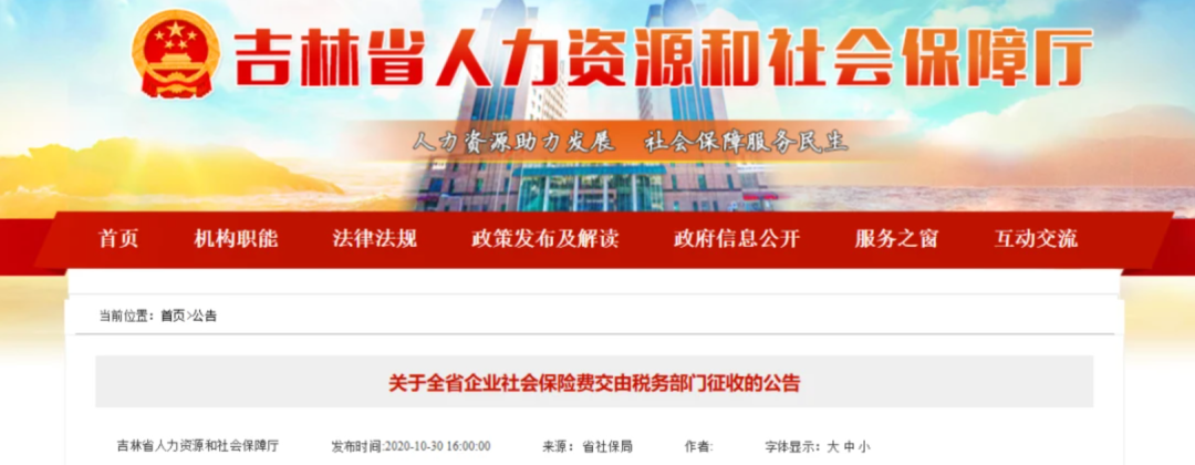 10月30日 北京、上海、山東、山西、湖南、四川、貴州、吉林、江西等地同時發布了《關于企業社會保險費交由稅務部門征收的公告》的通知。