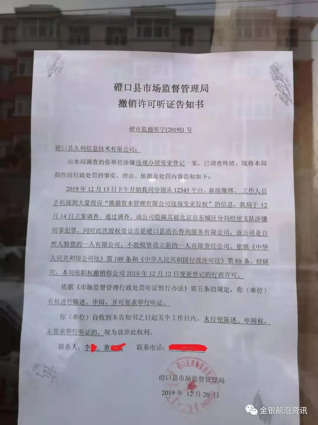 (2)好消息是注冊地址門上貼了一張“磴口縣市場監督管理局-撤銷許可聽證告知書”,借友加了該工作人員聯系方式,為了保護隱私,特地打碼,后期根據情況再決定是否公開。希望每個人都認認真真、一字不落的讀上五六七八遍,這是多少兄弟姐妹的心血和期盼!!!!